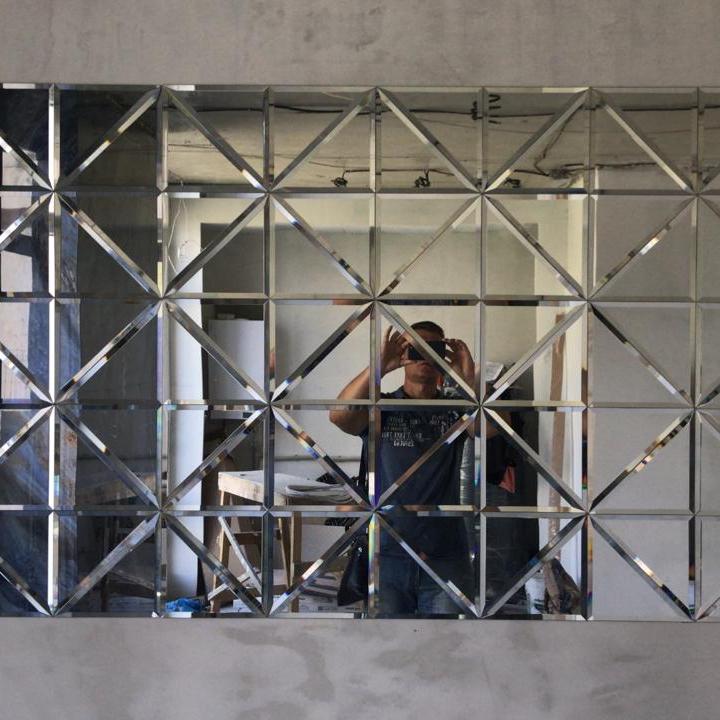 Использована квадратная серебристая зеркальная плитка размером 18х18.
